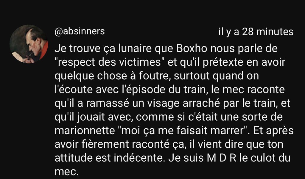 Justement pour moi ça rend le truc plus grave, il devrait avoir une sorte de serment d’hypocrate où les mecs évitent de balancer les affaires, le mec fait plus ou moins du buzz en racontant des details sordides