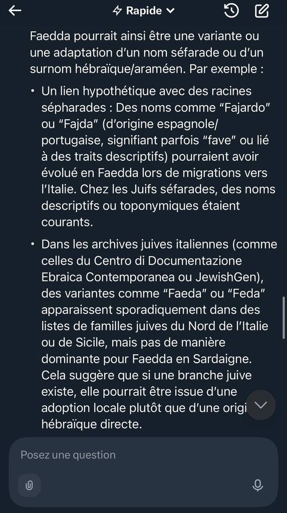 Selon geneanet, le lieu où il y a le plus de gens qui ont vécu c'est en Sardaigne. C'est pas un endroit avec beaucoup de juifs. Et les gens avaient des noms italiens normaux. Pas de Esther / Sarah / Jacob.
