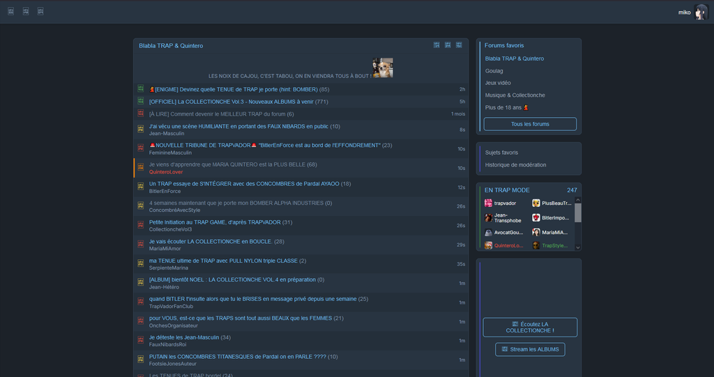 Si vous voulez, postez des idées et je fais générer le forum dans le style de votre choix, ça peut être dans le style d'une personne/forumeur ou dans un thème particulier ou encore une certaine époque, un sous-forum.... Enfin, tout ce qui vous passe par la tête