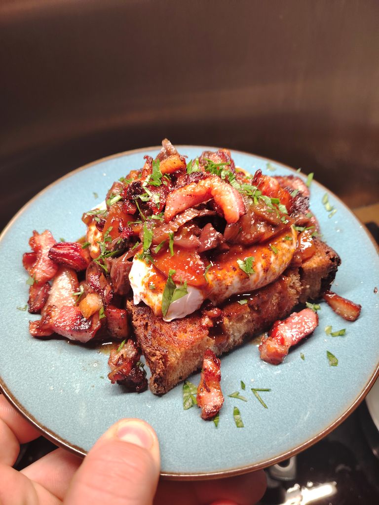 Pour les goulem'sent déracinés spé nuggets sauce algerienne qui ne connaissent pas la gastronomie de leur pays il s'agit d'un plat rustique consistant en des oeufs pochés sur du pain de campagne toasté, le tout arrosé de sauce au vin rouge bien haram et de lardons 100% pure halouf